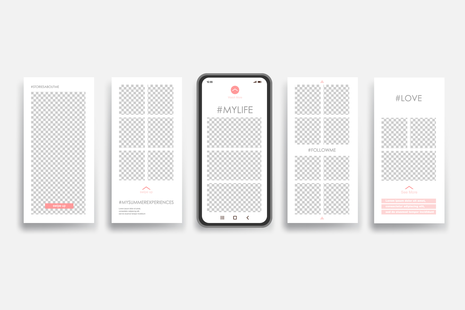 Created universal story templates in flat and hipster style with streaming elements, designed for app development, social media promos, and portfolios.